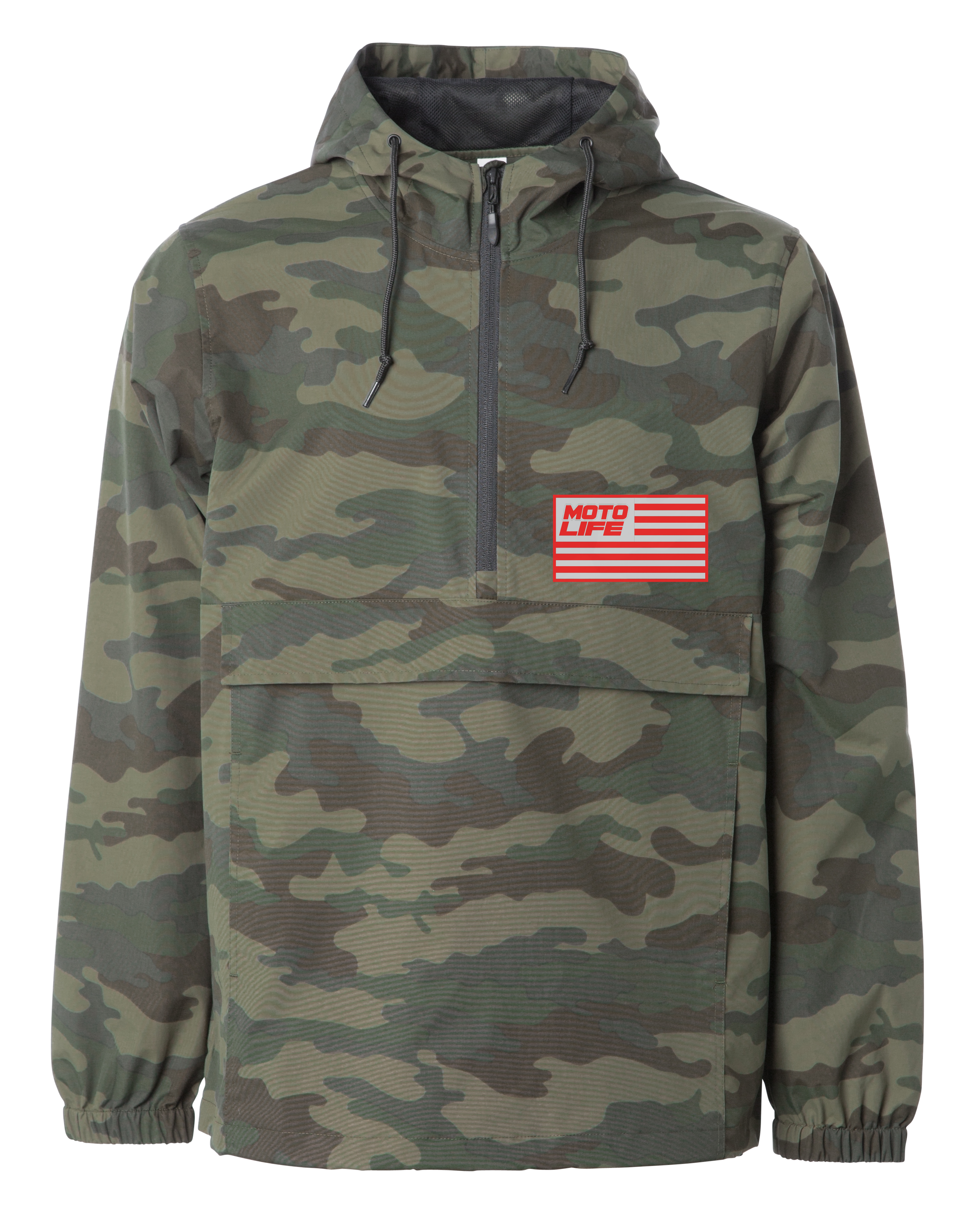 Half zip for easy on, easy off. Hidden zipper kangaroo pocket with inside snaps to keep the goods out of the elements